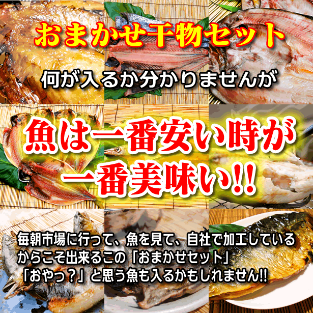 干物の福袋 魚は美味い時が一番安い!! つまり旬となります! 当店定番の商品と旬の魚をセットにしてお届けします! 毎日魚市場に店主自ら足を運んで 旬の魚を仕入れるからこそできるこの「おまかせセット」 開けてビックリのお得なセットです! 商品表示 名称 おまかせ干物セット 内容量 ★